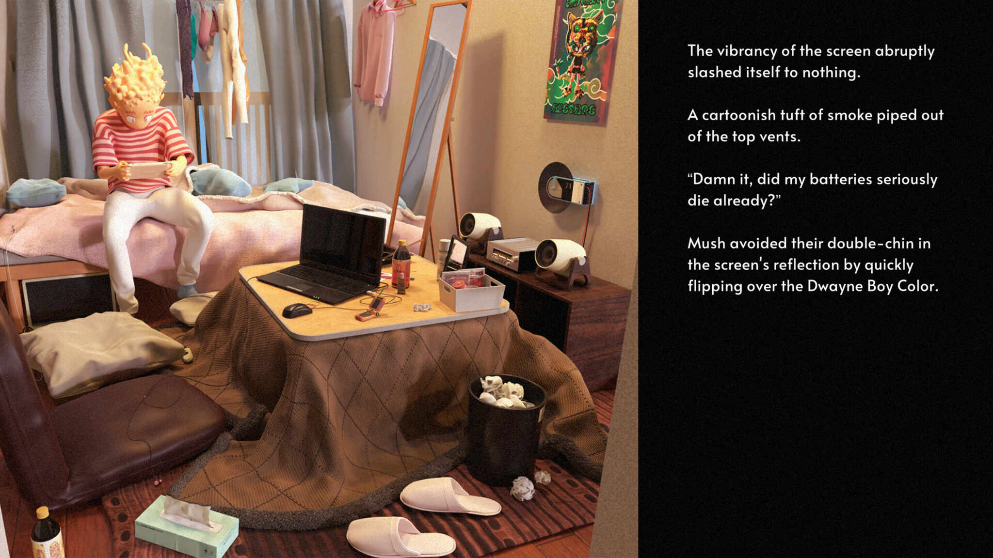 A short visual novel set in the world of a monster-collecting RPG. Grappling with their ability to perceive reality through an RPG lens, Mush navigates their way to a job interview for the enigmatic title of “Dome-King.” The narrative is told through an unmistakable, perception-bending style by the solo-developer Cobysoft Joe. Dome-King Cabbage is a vibrant collection of psychedelic visuals, warbled beats, and colorful stories that connect in a harmonious way because of this singular vision.