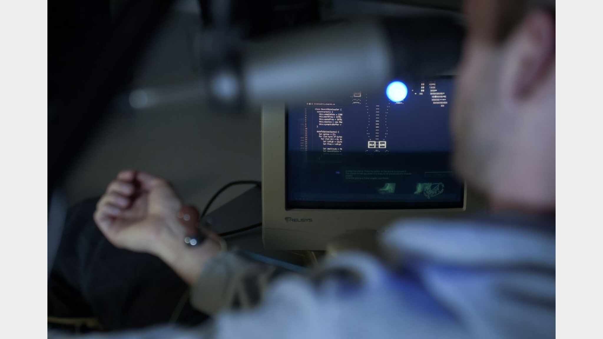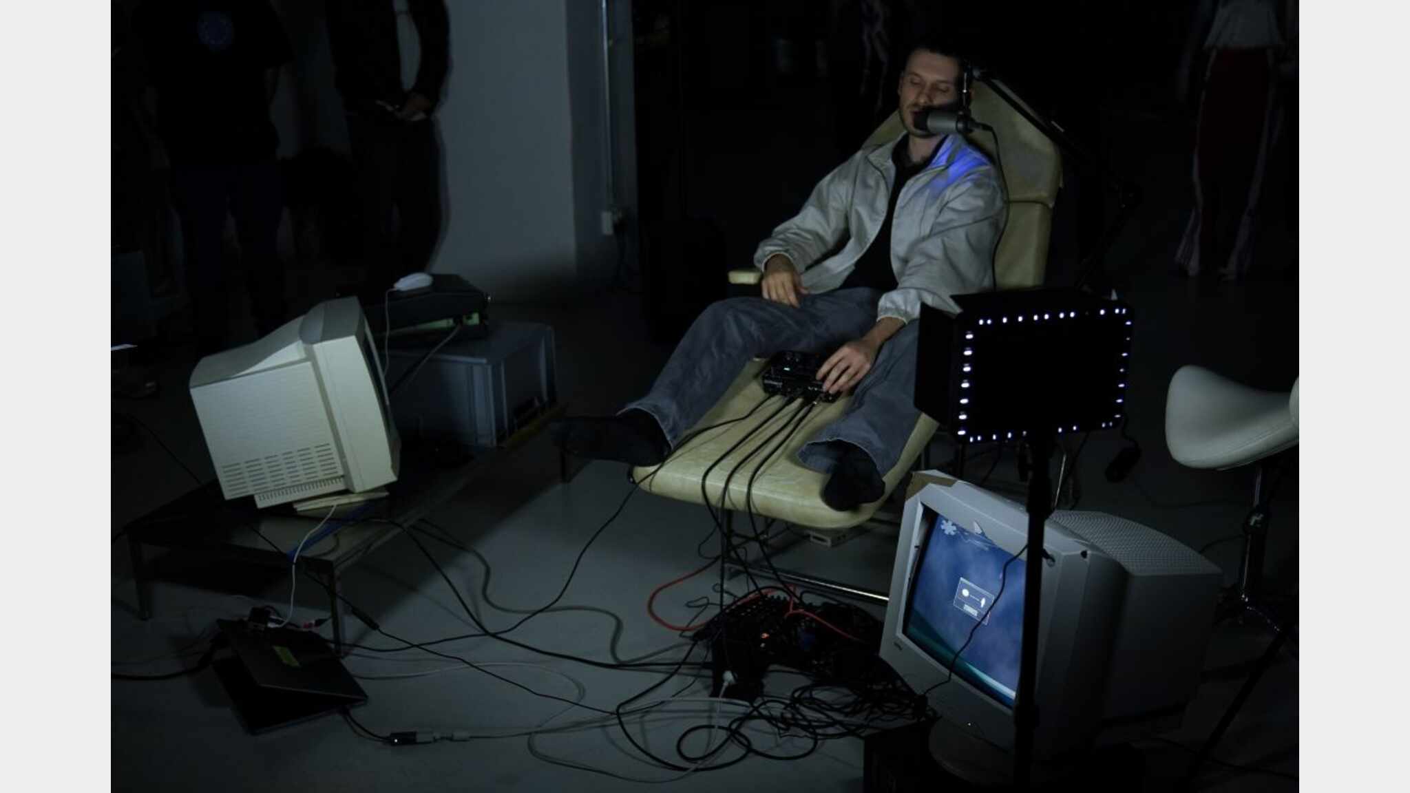 Flesh Network presents a history of the Internet as sound technology, examining disability and communication design. A custom 2D game interface instructs audience volunteers to manipulate a Host’s body, progressing from deaf communication techniques to telephone-era interventions.
