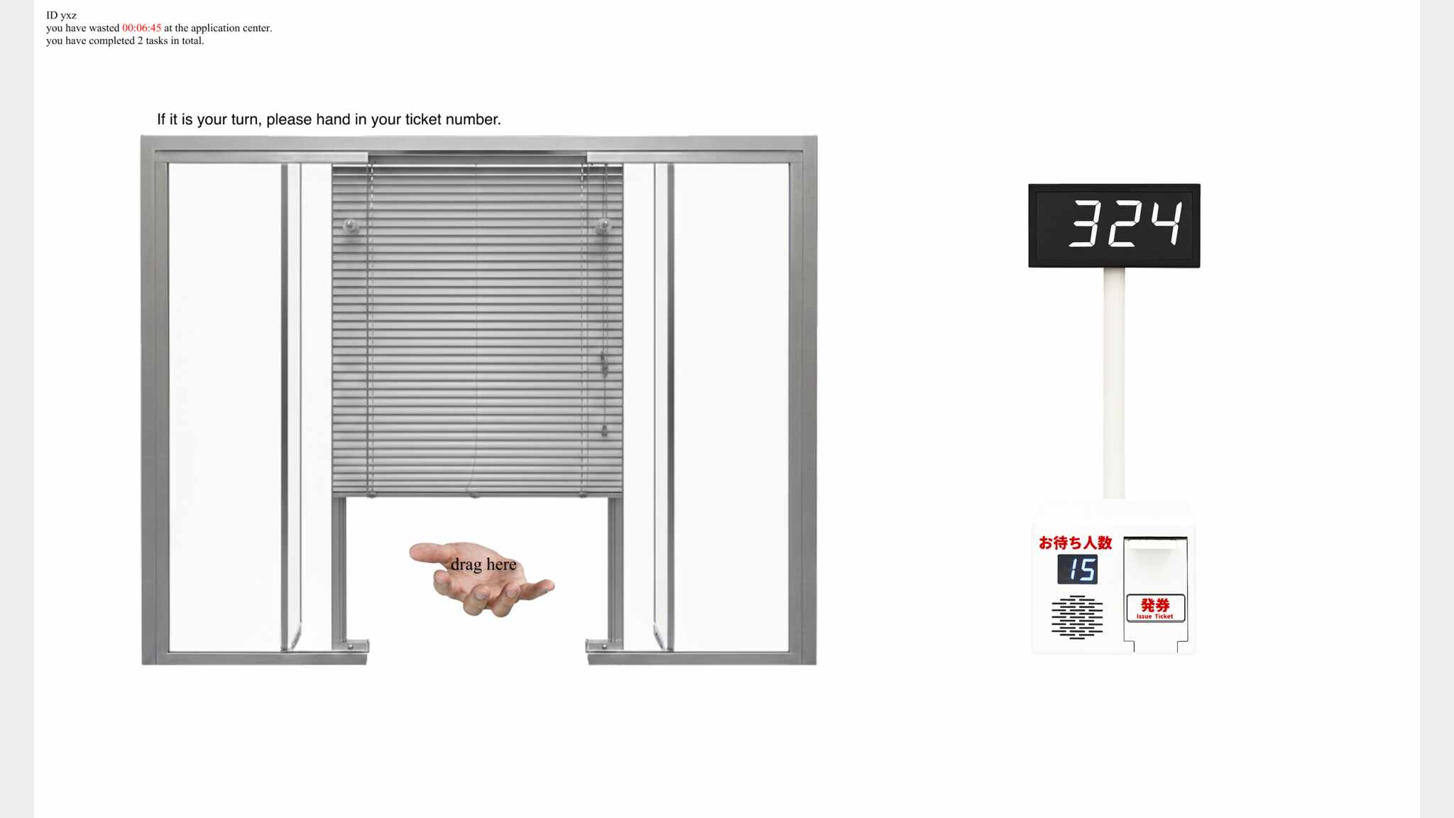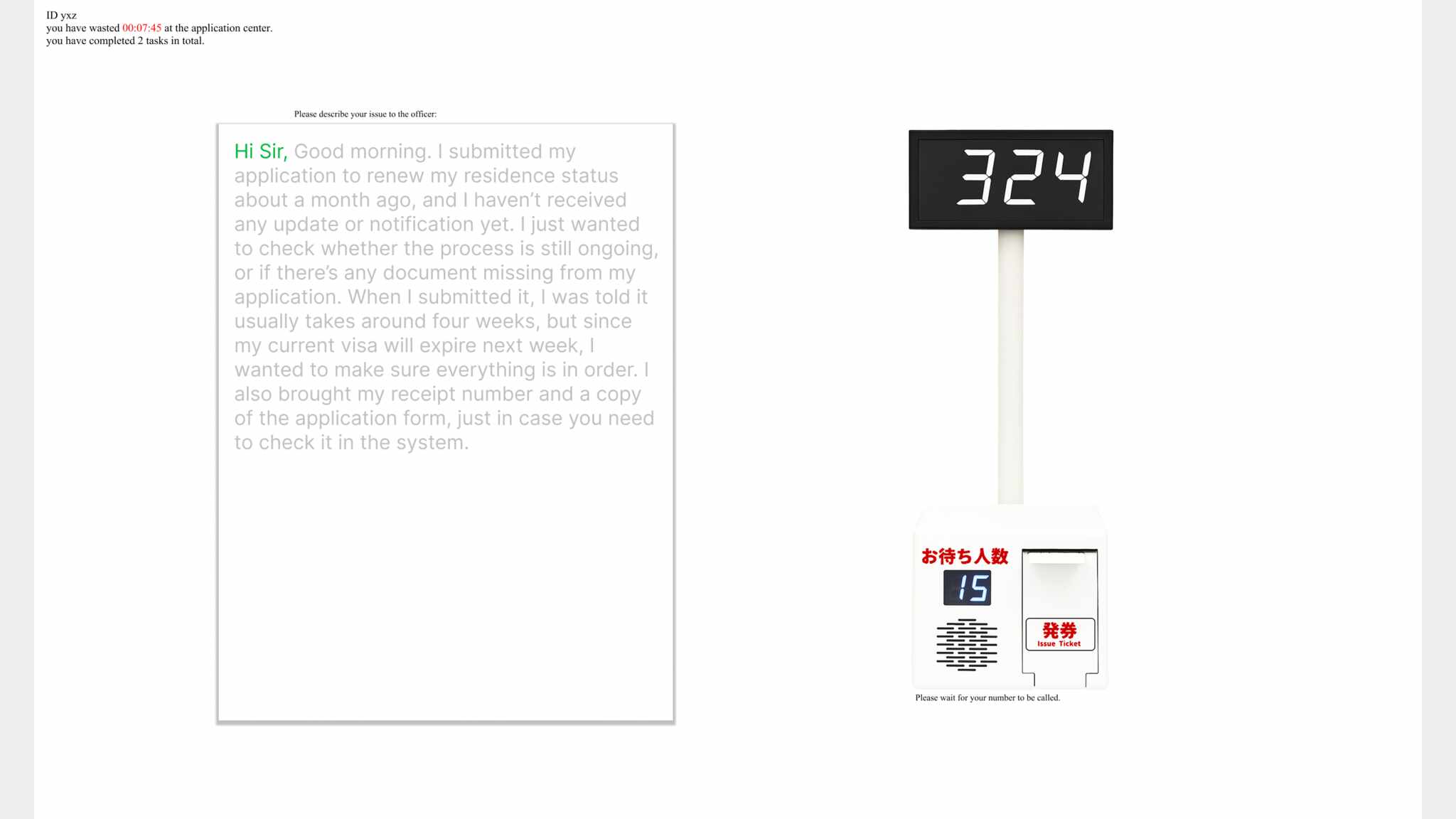 Gather your documents is an experimental massive multiplayer online game simulating the tedious, time-consuming, opaque experience waiting in immigration/administrative offices. Players share a queue and compete by predicting when to return, they need to minimizing time spent waiting while completing as many tasks as possible.
