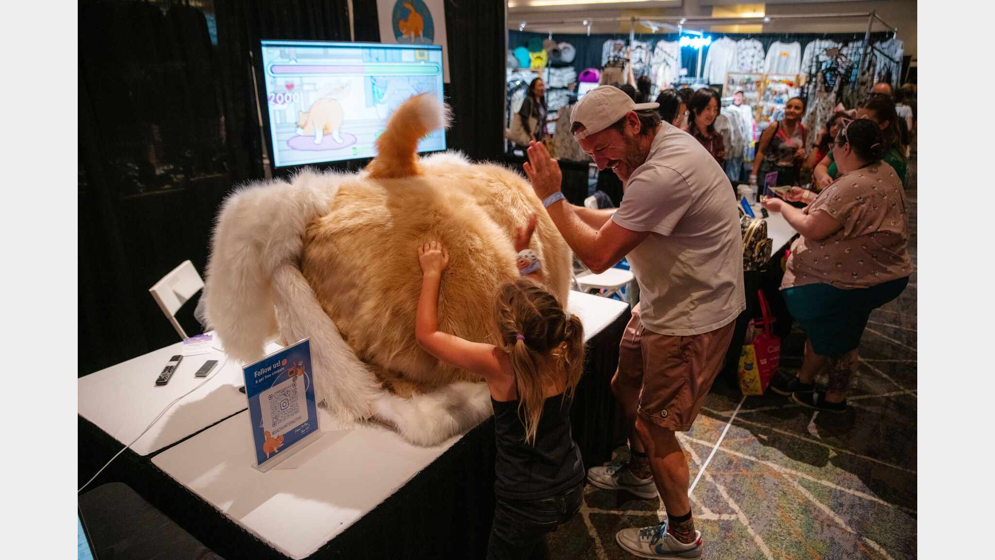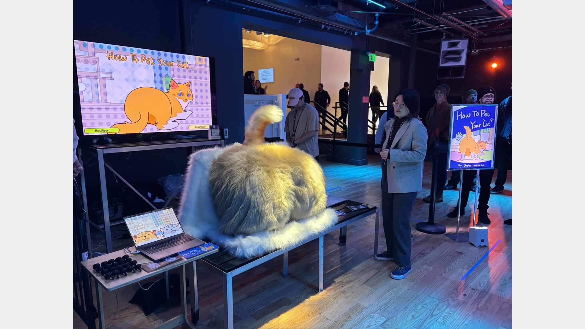 How to Pet Your Cat(HTPYC) is an alt-control game and social installation that explores human–human–machine connection through an act as simple as petting a giant cat. At its center is an oversized plush cat-butt controller wired with a grid of pressure sensors, driving a two-player PC game. Players touch, stroke, and pat the controller’s cheeks while two virtual cats respond with purrs, protests, and score feedback in real time; in 30-second rounds, they compete to see whose cat is more pleased. The piece treats touch as both input and performance. Every gesture has a location, rhythm, and intensity that the system reads and translates into animation and sound, “teaching” players how to pet their cat. Players test strategies, search for sweet spots, and learn to read the cats’ moods from their responses. Around them, onlookers laugh, shout advice, and often end up taking a turn themselves. The controller’s absurd scale and softness lowers inhibition, turning play into a shared, contagious event. As a human–human–machine interface, HTPYC positions the device as a mediator between bodies rather than a replacement for them. It creates a low-stakes buffer zone where physical comedy, embarrassment, care, and curiosity can surface safely, with the virtual cats acting as focal points for a temporary community around a shared tactile medium. Sitting between arcade cabinet, performance piece, and soft sculpture, it invites people to play with, and with each other through, a gently ridiculous machine. Developed by DaChu Interactive, the project has been exhibited at game festivals and cat conventions, including fundraising events with animal nonprofits. In each context it generates queues, repeat play, and spontaneous conversations between strangers. By foregrounding touch, humor, and social presence over purely visual spectacle, HTPYC asks what kinds of playful, felt connections remain difficult to reproduce in purely digital space.
