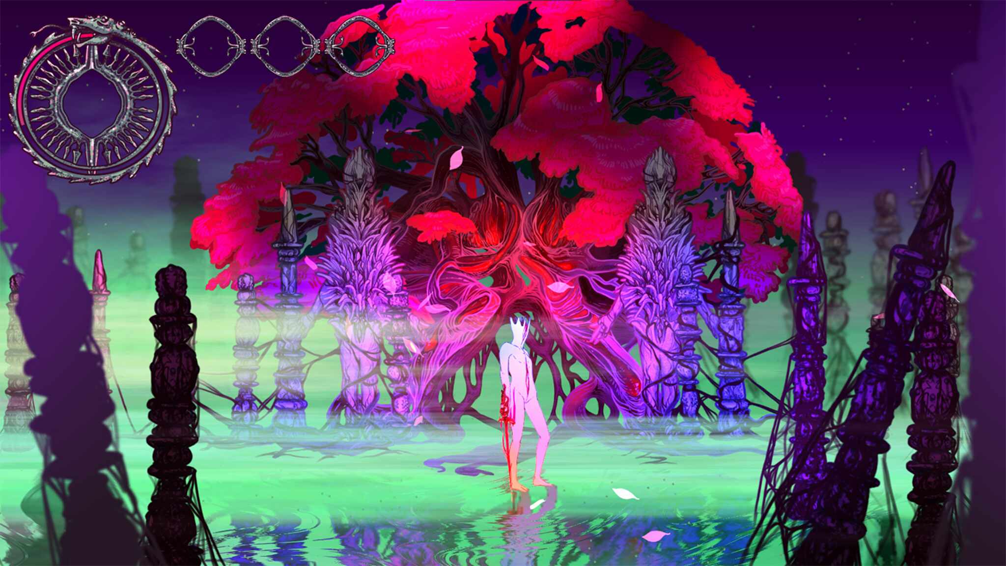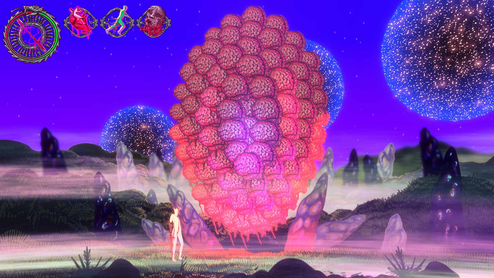 Namtar unfolds in an alien purgatory—a world shaped from dreams—where rebirth is not salvation but an endless cycle of transformation, decay, and becoming. Set within a psychedelic, color-saturated landscape that feels both grotesque and mesmerizing, the game explores metamorphosis as a violent yet necessary force, exposing the discomfort and vulnerability of change alongside the fragile beauty of nature in constant flux. Experience rebirth into a hand-drawn neon purgatory, animated frame-by-frame, that blends the grotesque designs of H. R Giger with the dreamlike visions of Moebius. The result is is an aesthetic distinct from its peers-Blasphemous, Gris and Castelvania- that features surreal vibrant body horror as well as vivid alien landscapes. This vision is realized through a frame-by-frame animated action-adventure experience with bullet-hell elements, born from visual experimentation across multiple graphics forms; every character, environment, and effect is uniquely illustrated, creating a tactile, ever-shifting world where horror and elegance coexist through relentless motion and combat.