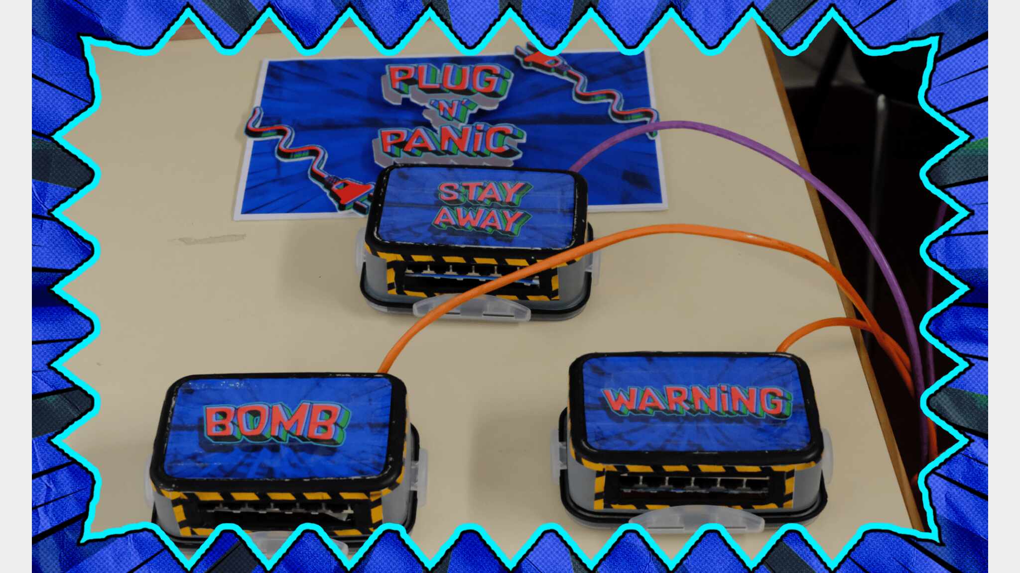 Plug ’n’ Panic is a chaotic cooperative party game about defusing a bomb with terrible software and even worse teamwork. You are part of the world’s least coordinated spy team, armed with an experimental hacking device that might save the world. Or might make things worse. Each player wears a Hacky Tacky device strapped to their arm with four cables of different lengths. To disable the bomb, players must physically connect themselves to different modules spread across the space. Each module reacts to colors and cables and features multiple USB ports, forcing players to move, stretch, and negotiate under pressure. Players also wear colored ties, red or blue, adding visual confusion and quick decision making to the chaos. With limited reach, bad timing, and too many cables crossing at once, communication quickly breaks down and panic takes over. Plug ’n’ Panic turns physical space into the puzzle. Success depends on coordination, trust, and a bit of luck. You might save the world. Probably not.
