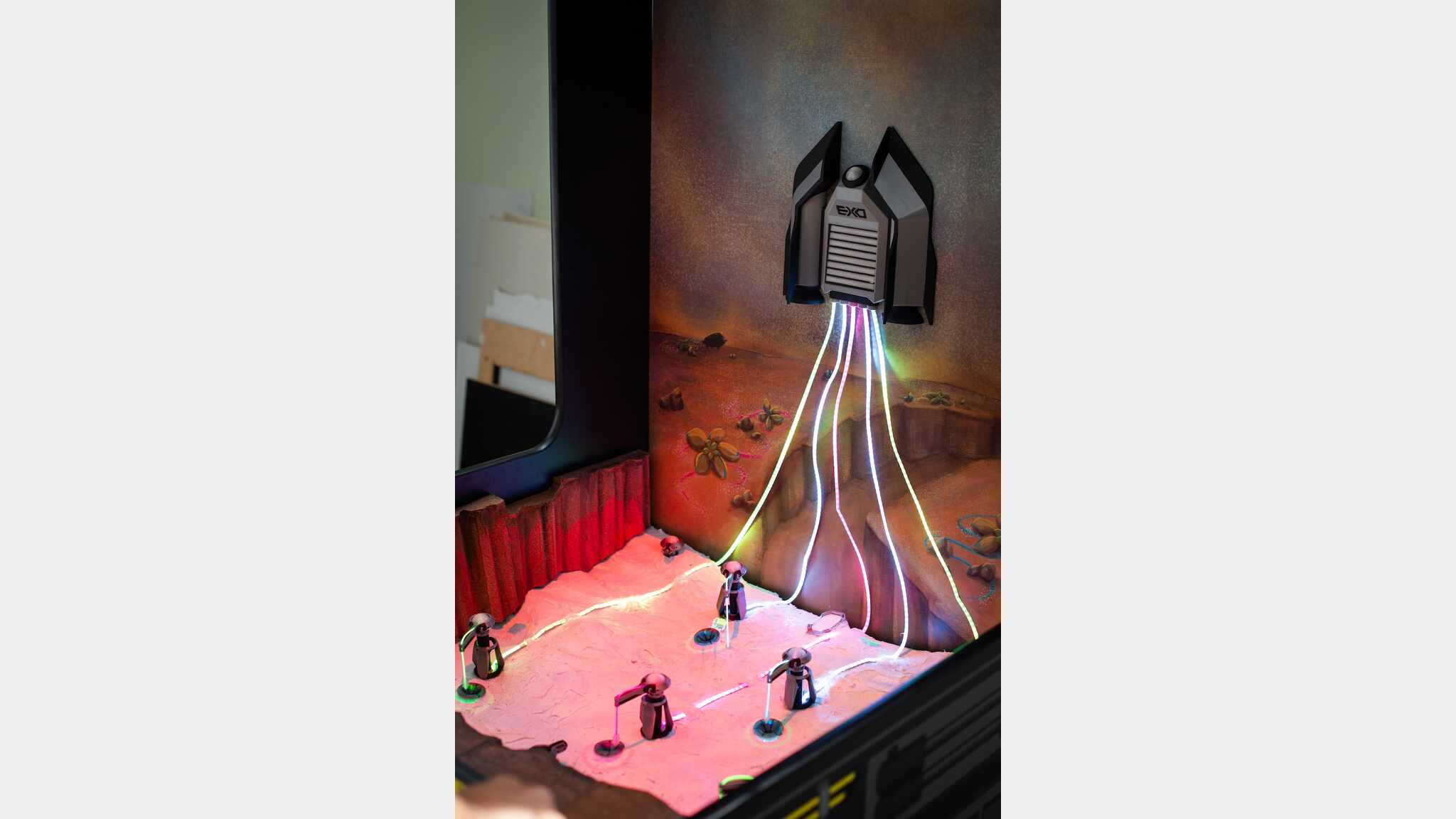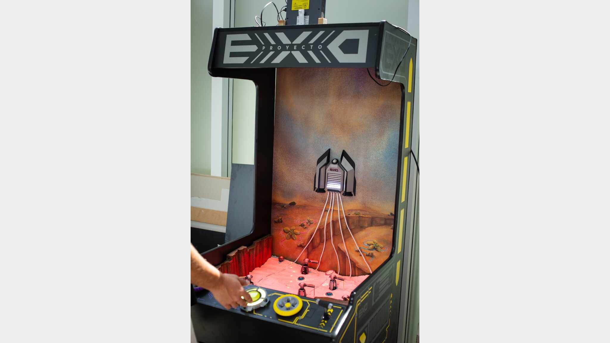 Proyecto EXO is an electromechanical game that blends physical moving components with a projected alien world where two players control rovers, cranes, and turrets. Drive across mountains, defend and fix extraction rigs from hostile creatures, and channel energy to your ship. A vivid fusion of digital projection, motorized machines, and fast co-op action.