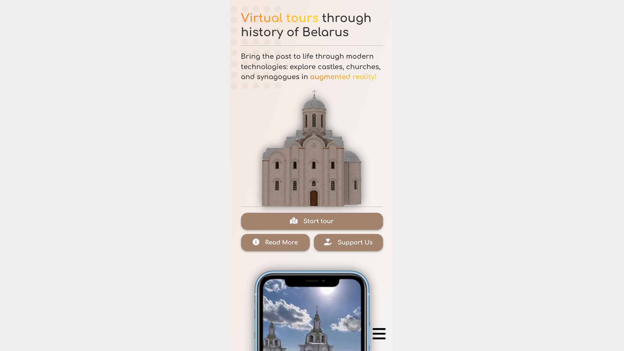 XRAYTOURS invites you to travel through the lost architectural heritage of Belarus — virtually, playfully, and directly in your browser. The project brings back buildings and places that no longer exist, turning them into spaces you can explore, move around, and experience again. Using WebXR, XRAYTOURS lets you walk through history, scale monuments, place them in your own space, and interact with architecture that has disappeared from the physical world. No downloads, no installations — just open the site and start exploring. The project is currently in early beta, with a basic set of interactive features available and new experiences in development. By transforming lost architecture into shared digital spaces, XRAYTOURS stands against the erasure of cultural space and keeps the memory of Belarusian heritage alive through curiosit and exploration.